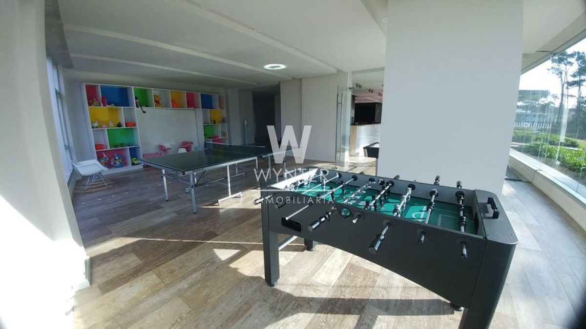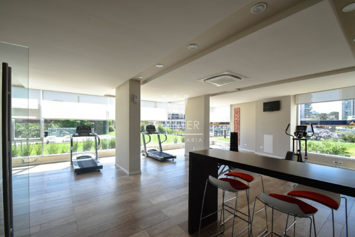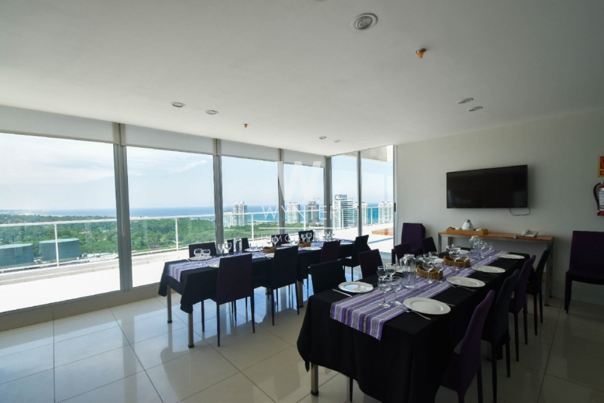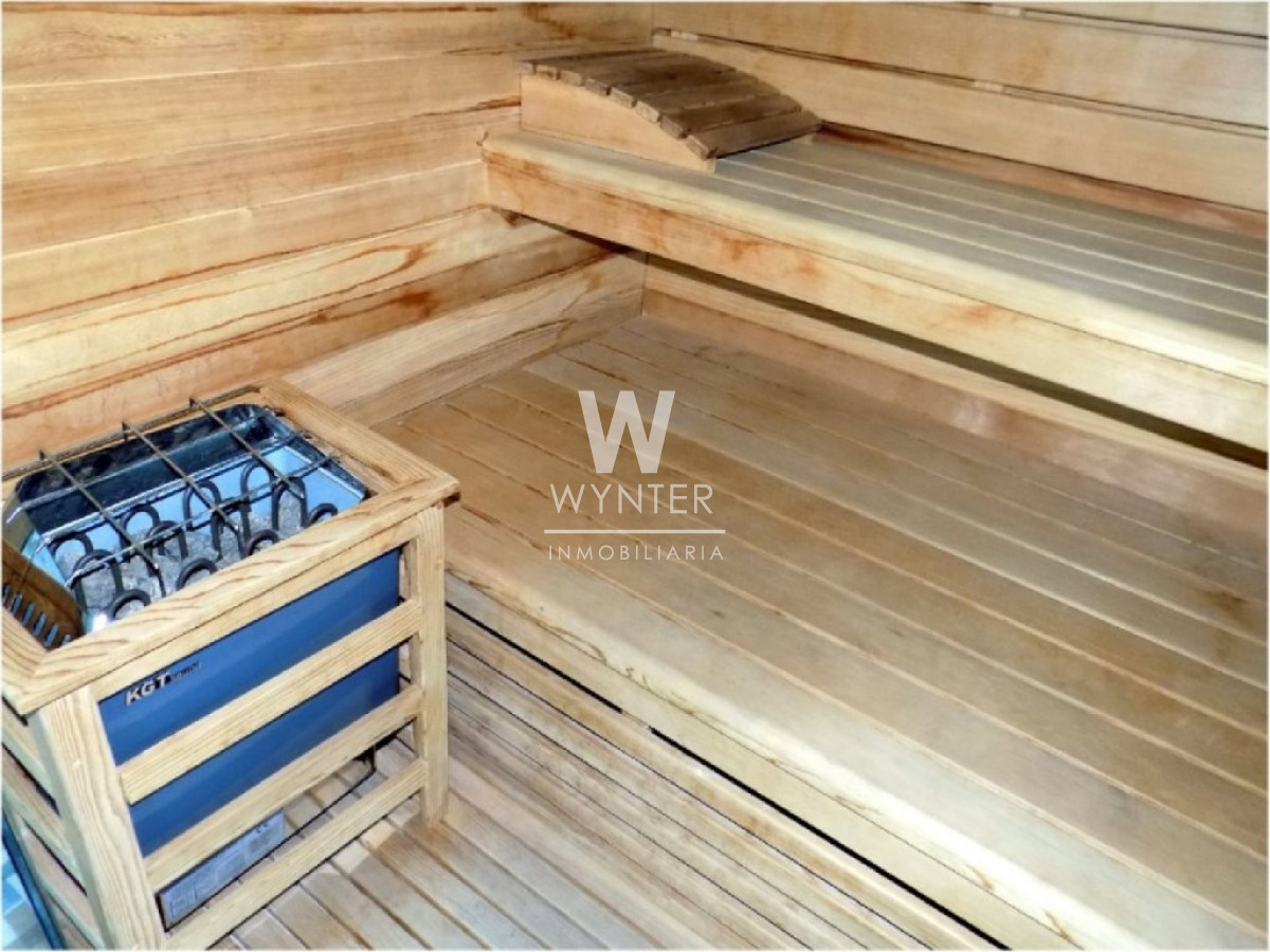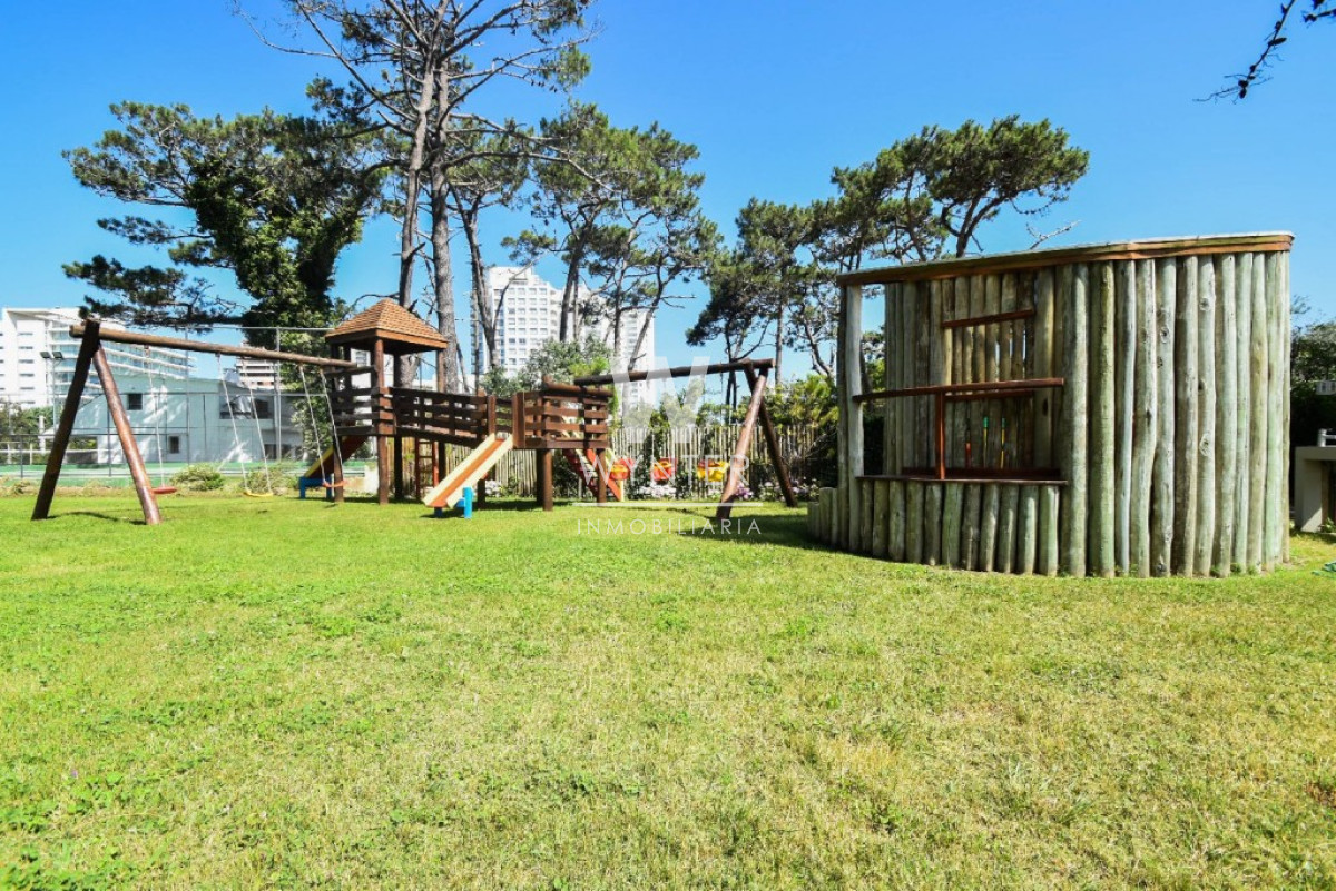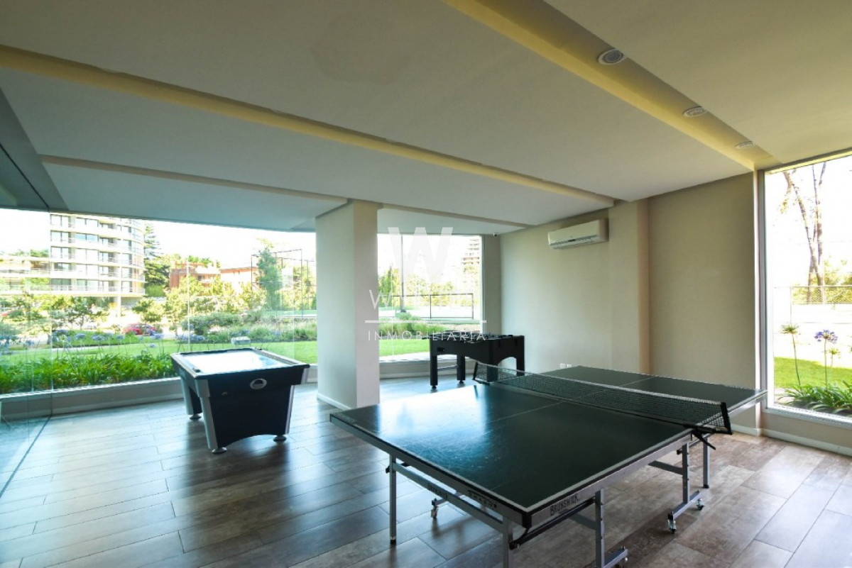 El edificio cuenta con recepción y vigilancia durante las 24 hs, servicio de mucamas una vez a la semana, sala de juegos para niños y adolescentes, gimnasio, sauna, piscina abierta y cerrada climatizada, microcine, juegos para niños al aire libre, cancha de tenis y barbacoas en el último piso con espectaculares vistas.