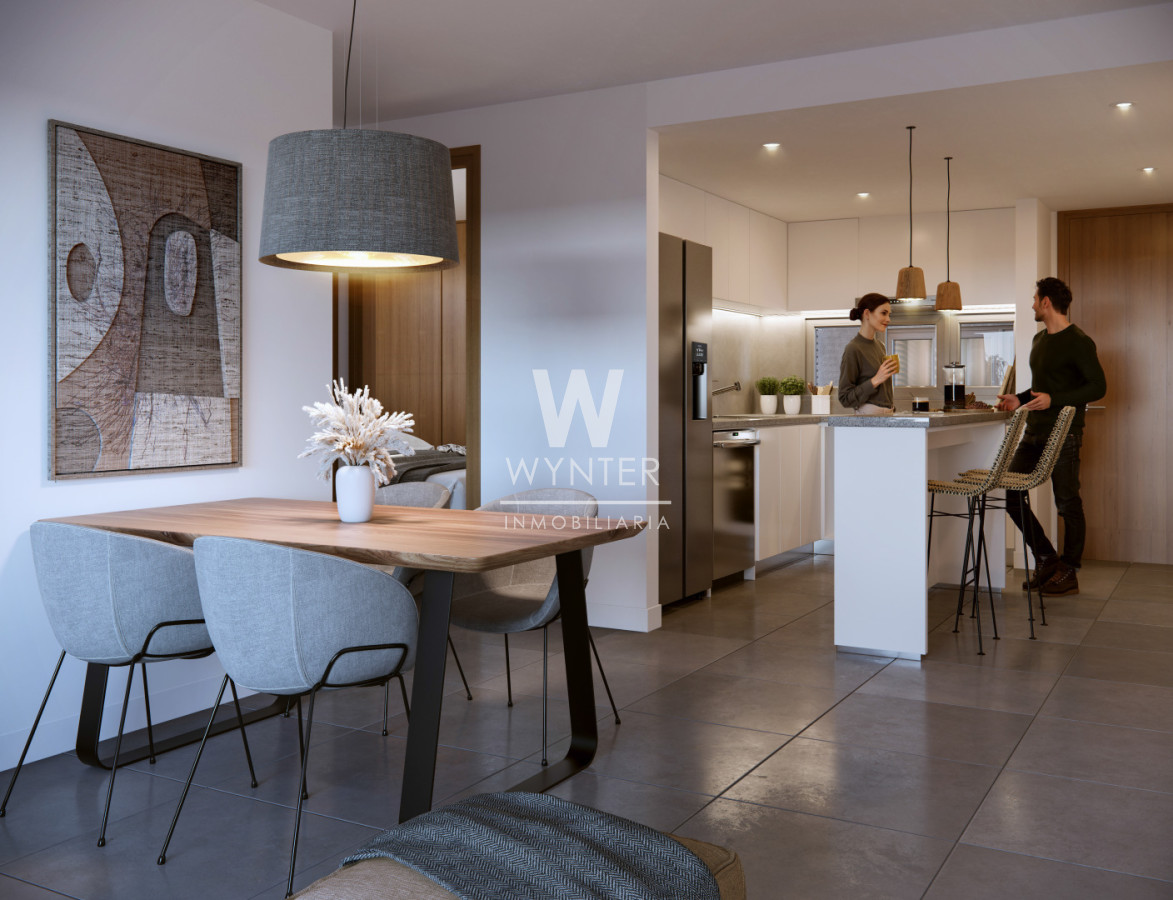 Estas unidades corresponden a los cuatro apartamentos esquineros de la torre, diseñados para maximizar la luminosidad y las vistas. Cuentan con una amplia cocina-comedor integrada, un dormitorio en suite y un segundo dormitorio, acompañado de un baño completo para mayor comodidad.